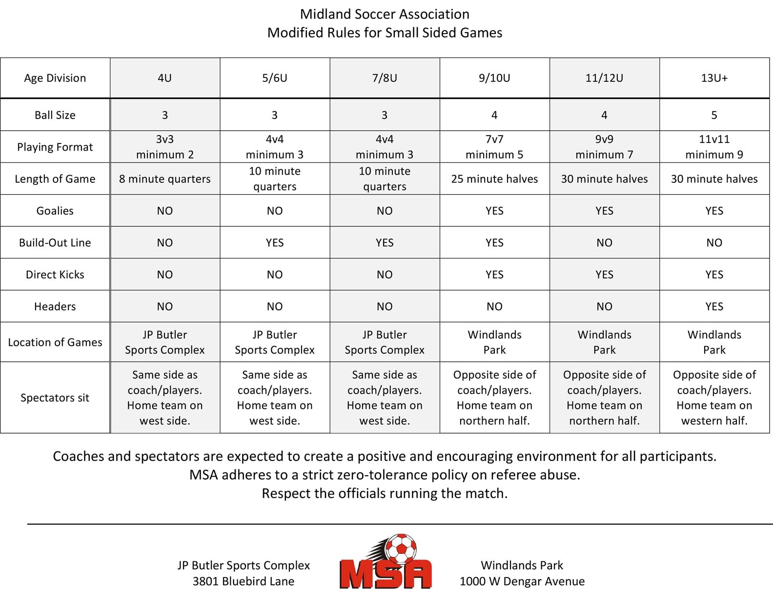 Teams are formed according the players' birth years and their neighborhood elementary school. Each season, the teams are scheduled eight games and play at two parks, JP Butler Sports Complex and Windlands Park, provided exclusively for use by MSA.